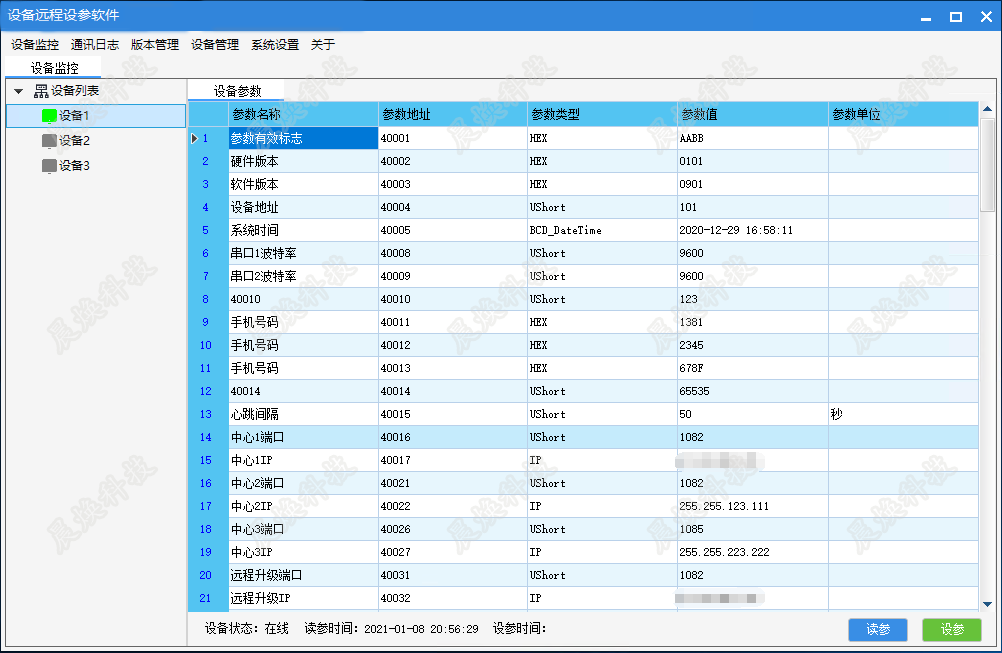 软件功能:设备通过4G上网连接服务器上的设参软件,通讯协议为厂家自定义协议。设参软件支持远程读设参、远程升级程序,自主添加设备版本和现场设备。